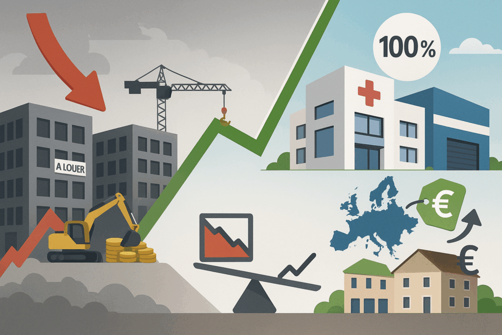 - Ralentissement de la reprise : Après un début de rebond au premier semestre 2025. Le troisième trimestre a ralenti, confirmant un "faux départ" en France. L'investissement immobilier européen affiche une légère progression, mais les signaux positifs restent timides et inégaux selon les pays.